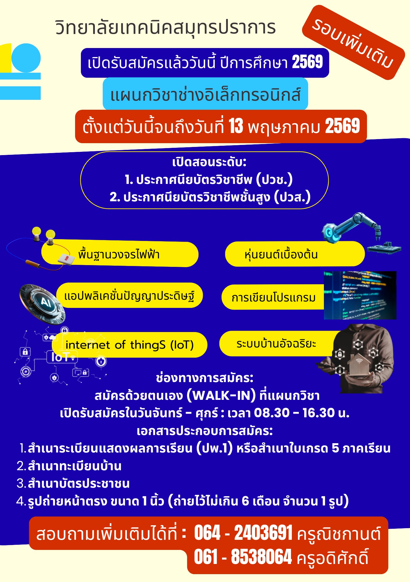 วันที่ 4 กุมภาพันธ์ 2569 ชมรมวิชาชีพวิชาช่างอิเล็กทรอนิกส์ จัดโครงการแสดงสิ่งประดิษฐ์และนวัตกรรมของนักเรียน นักศึกษา แผนกวิชาช่างอิเล็กทรอนิกส์ ประจำปีการศึกษา 2568 ภายในงานมีการแสดงผลงานของนักเรียน นักศึกษา ในรายวิชาโครงการของระดับชั้น ปวช. และปวส. ดาวน์โหลดรูป