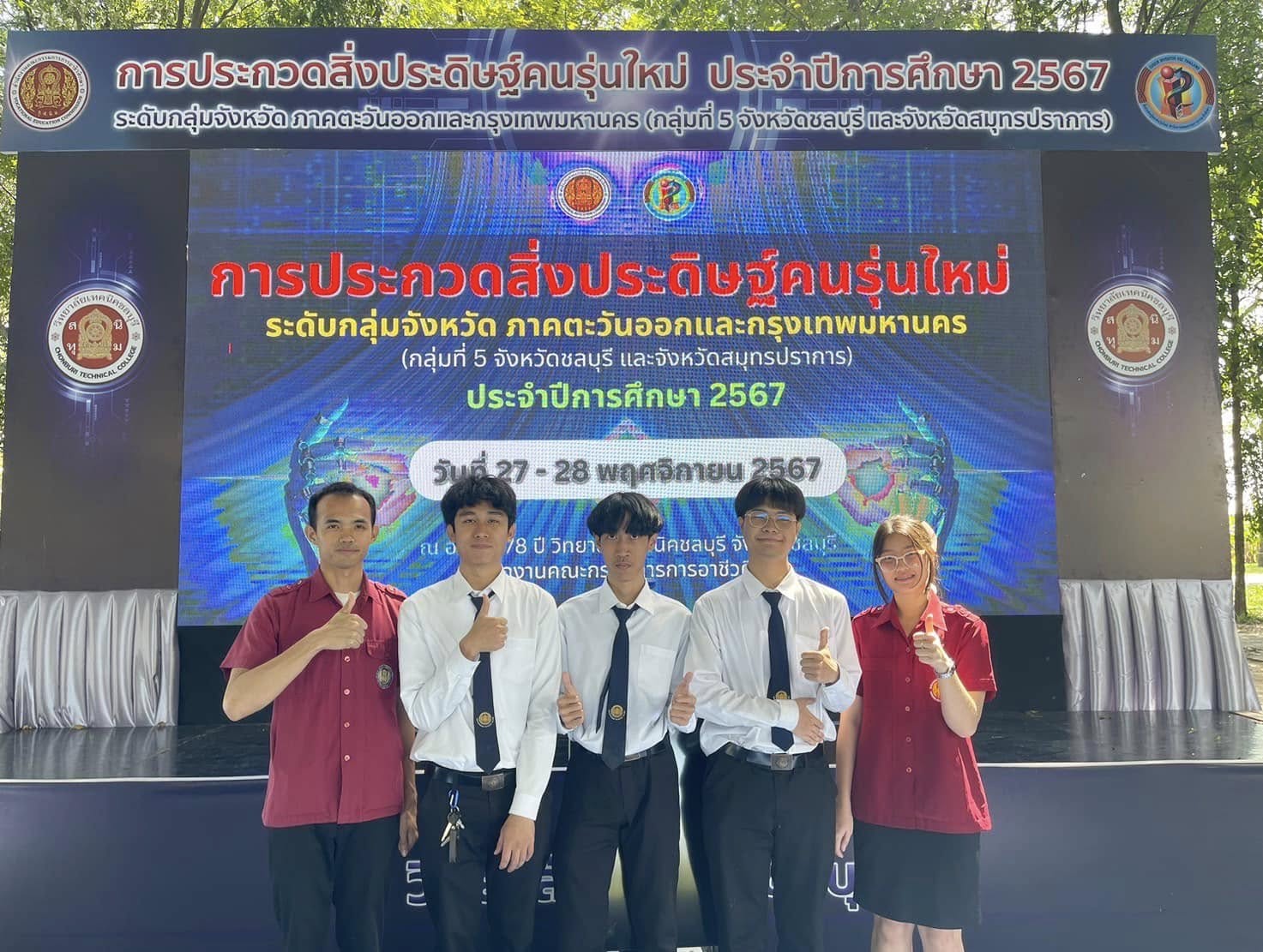 จากการประกวดสิ่งประดิษฐ์คนรุ่นใหม่ ระดับกลุ่มจังหวัดชลบุรีและจังหวัดสมุทรปราการ ประจำปีการศึกษา 2567 ระหว่างวันที่ 27 – 28 พฤศจิกายน 2567 ณ วิทยาลัยเทคนิคชลบุรี