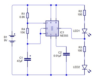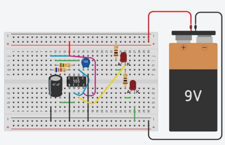 ในบทความนี้จะยกตัวอย่างภาพของวงจรอะสเตเบิ้ลมัลติไวเบรเตอร์โดยใช้ไอซี 555 โดยจากวงจรที่ออกแบบเป็นการจำลองการทำงานโดยใช้ TinkerCAD Circuit และการต่อวงจรจริง