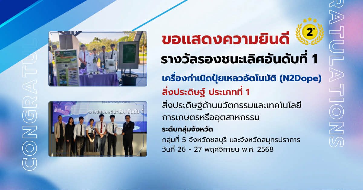 รางวัลรองชนะเลิศอันดับ 1 ผลงานเครื่องกำเนิดปุ๋ยเหลวอัตโนมัติสำหรับการปลูกผักออร์แกนิค (N2Dope) ครูผู้ควบคุม นายกรวิทย์ ภานิล นางสาวสุปาณี จันต๊ะเขต