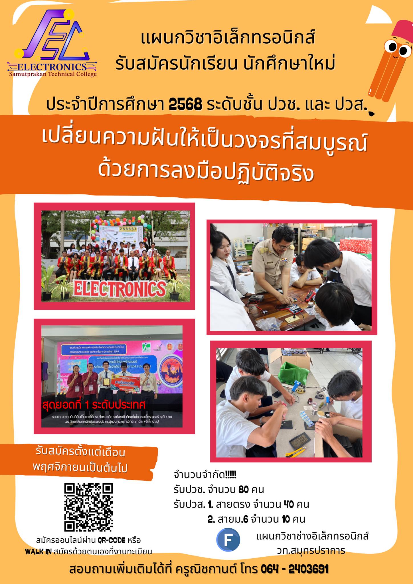 วิทยาลัยเทคนิคสมุทรปราการ รับสมัครนักเรียนที่กำลังศึกษาอยู่ในระดับมัธยมศึกษา ปีที่ 3 เพื่อเข้าศึกษาต่อระดับประกาศนียบัตรวิชาชีพ (ปวช.) และนักเรียนที่กำลังศึกษาอยู่ในระดับประกาศนียบัตรวิชาชีพ (ปวช.) ระดับมัธยมศึกษาปีที่ 6 หรือเทียบเท่า เพื่อเข้าศึกษาต่อระดับประกาศนียบัตรวิชาชีพชั้นสูง (ปวส.) ระบบโควตา ประจำปีการศึกษา 2568 (ตั้งแต่วันที่ 4 พ.ย 2567 – 17 มกราคม 2568)