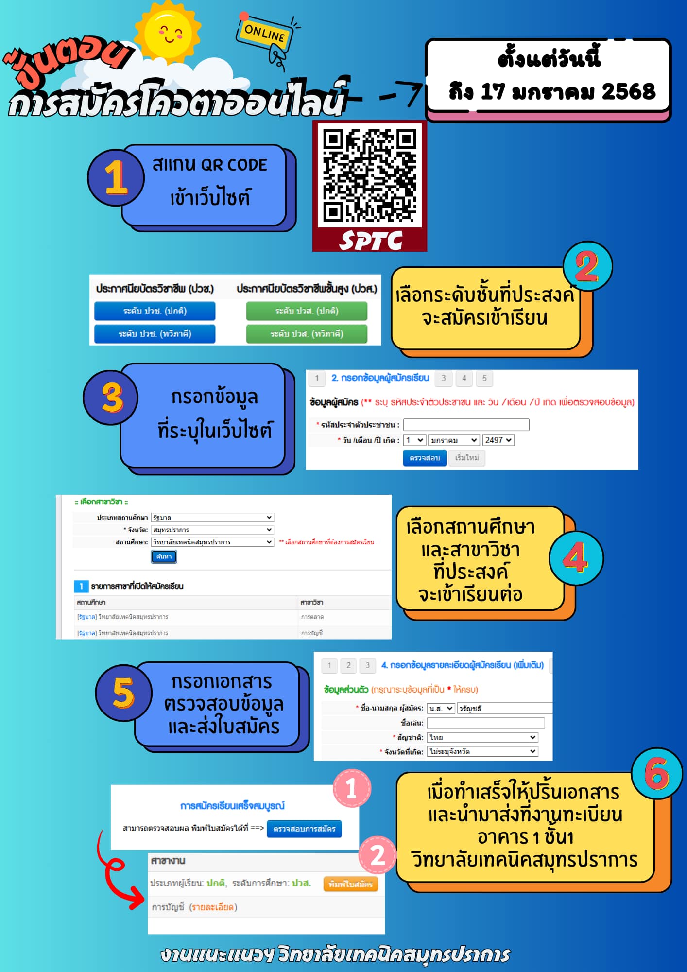 - สมัครเรียนออนไลน์ผ่านระบบรับสมัครนักเรียน นักศึกษา ที่เว็บไซต์ https://admission.vec.go.th/ ระบบบริหารสถานศึกษา ศธ. 02 ออนไลน์ ตั้งแต่วันที่ 4 พฤศจิกายน 2567 – 17 มกราคม 2568 พร้อมพิมพ์ใบสมัครจากระบบออนไลน์ และนำมายื่น ณ ห้องงานทะเบียน อาคาร 1 ชั้น 1 วิทยาลัยเทคนิคสมุทรปราการ